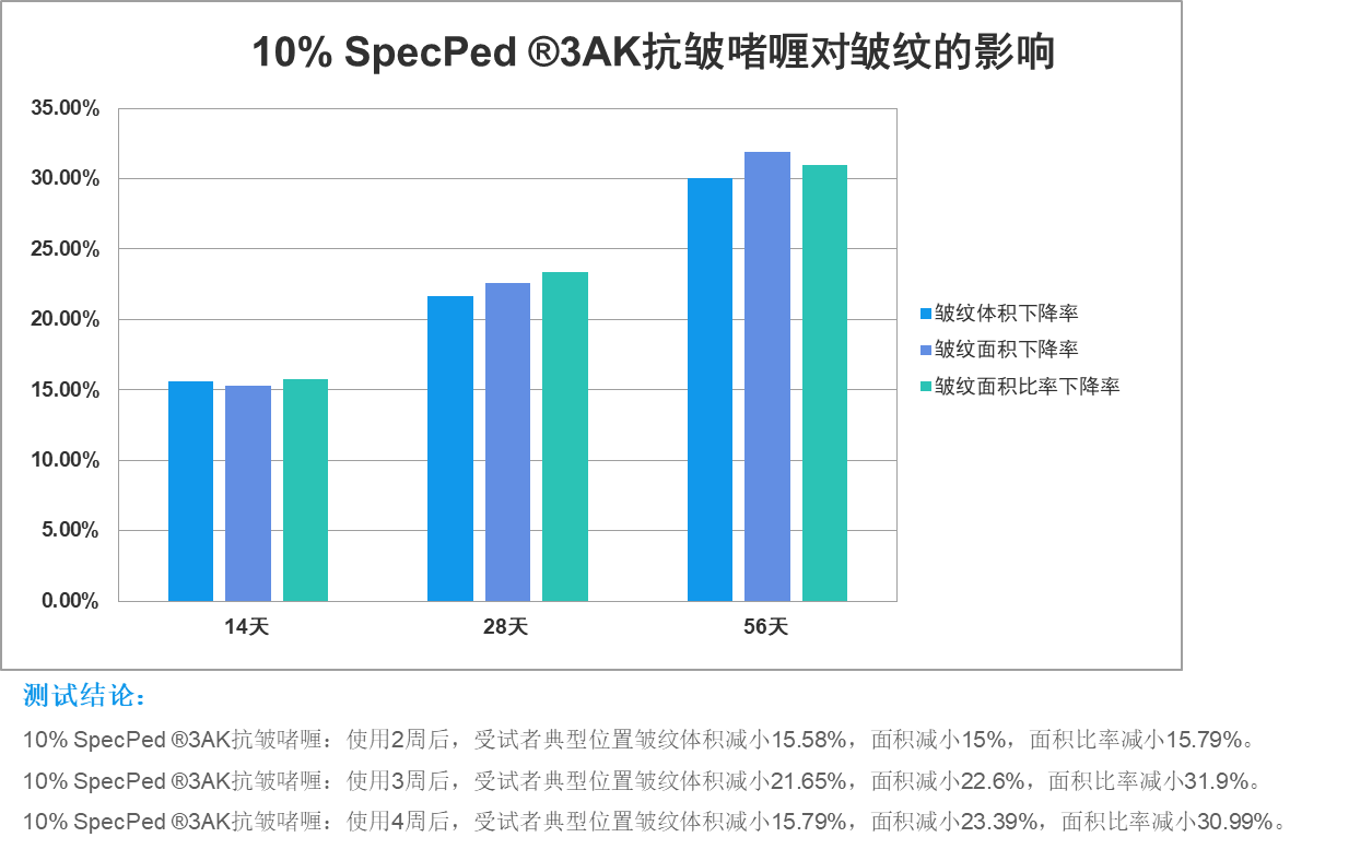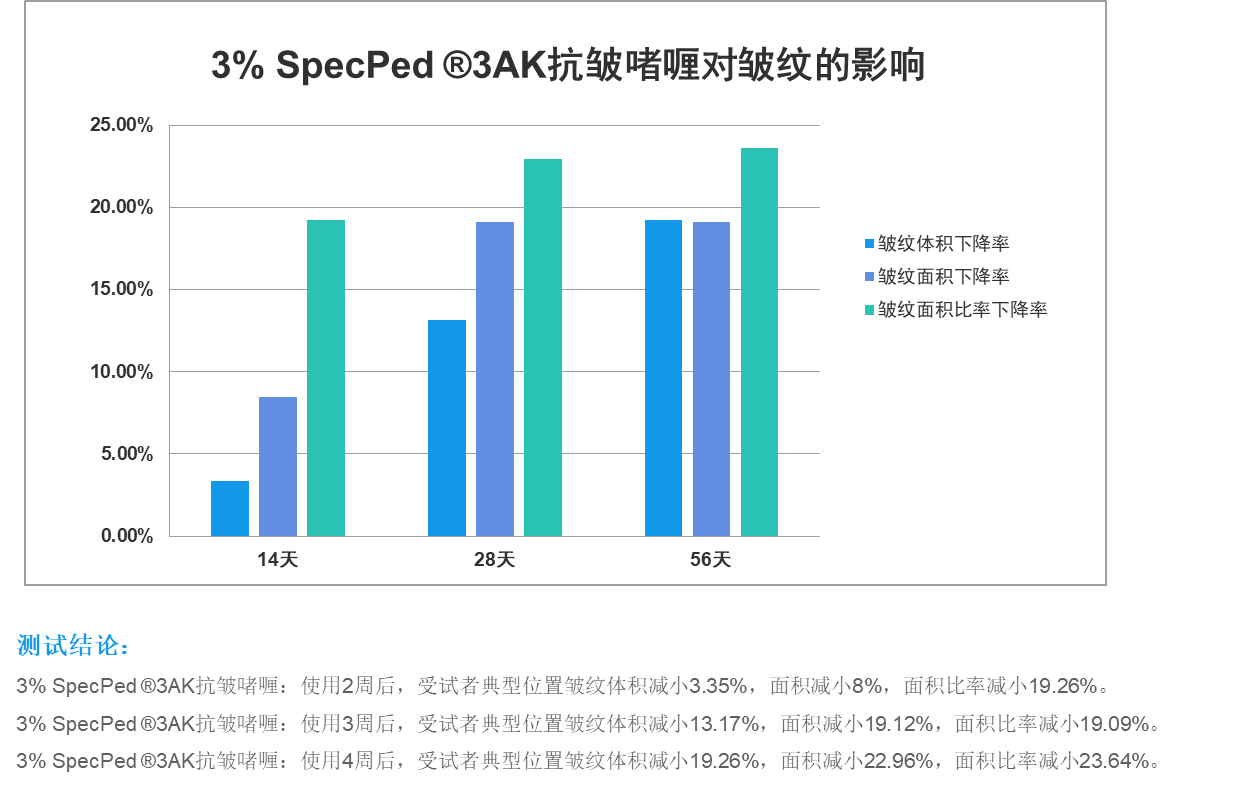 ?SpecPed? 3AK一方面通過(guò)組織生長(zhǎng)因子模仿人體自身激勵(lì)產(chǎn)生膠原蛋白,從而達(dá)到皺紋修復(fù)的目的。另一方面SpecPed? 3AK刺激任基膜聚糖的合成和作用于I 型膠原蛋白,促進(jìn)真皮重塑,達(dá)到緊致肌膚祛除皺紋的功效。